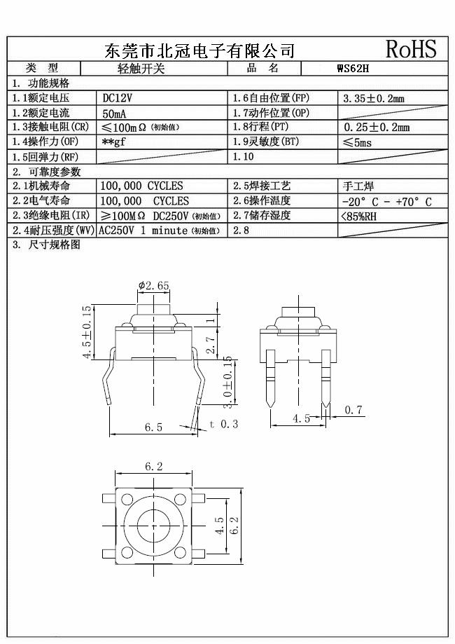 3.Lnsulation Resistance: ≥100mΩ DC250V