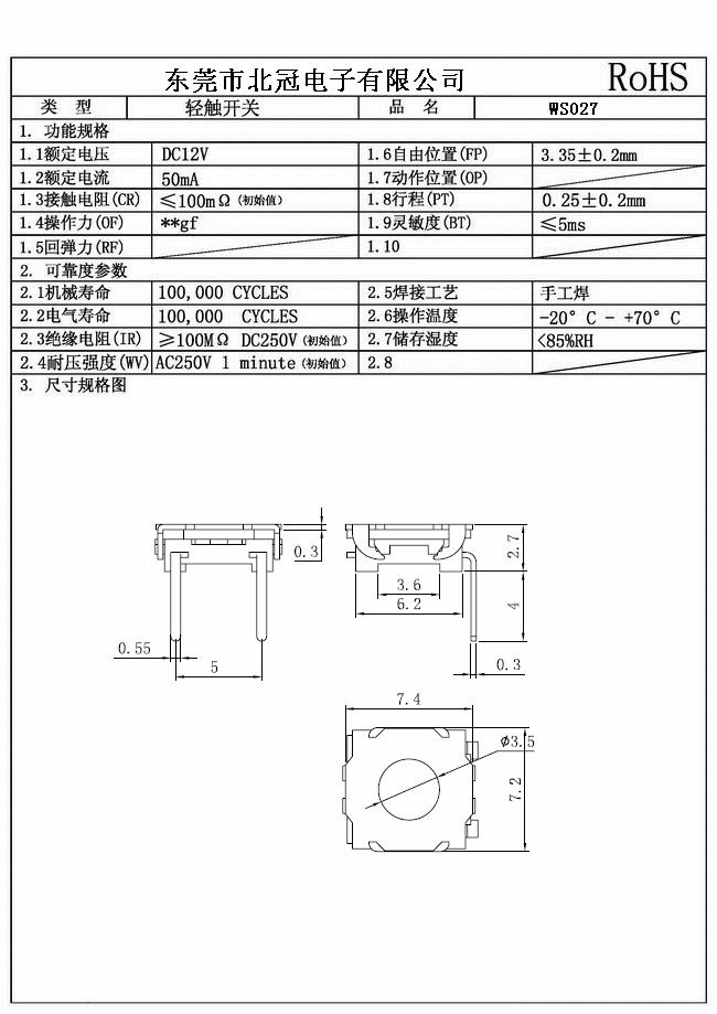 3.Lnsulation Resistance: ≥100mΩ DC250V